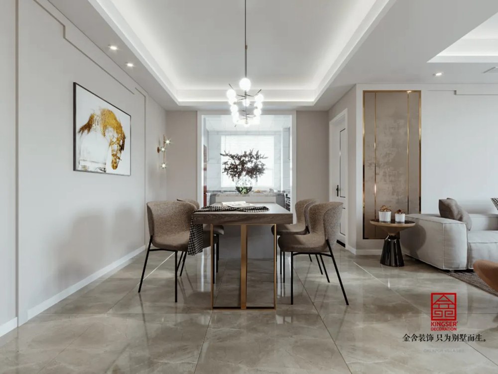 干凈明亮的餐廳空間借由藝術(shù)特質(zhì),有著一氣呵成的輕奢氣派,石材、布藝及金屬等多樣的材質(zhì)運(yùn)用使得空間靈動(dòng)而不失活潑。