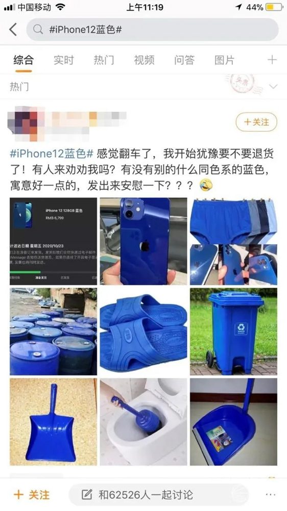 有網(wǎng)友在網(wǎng)上曝光了藍色 iPhone 12 的圖片,吐槽和官網(wǎng)色差嚴重,還有人找到了一組和 iPhone 同款的藍色物品,瞬間在網(wǎng)上發(fā)酵炸開了鍋,這個話題也迅速沖到了熱搜榜第一。