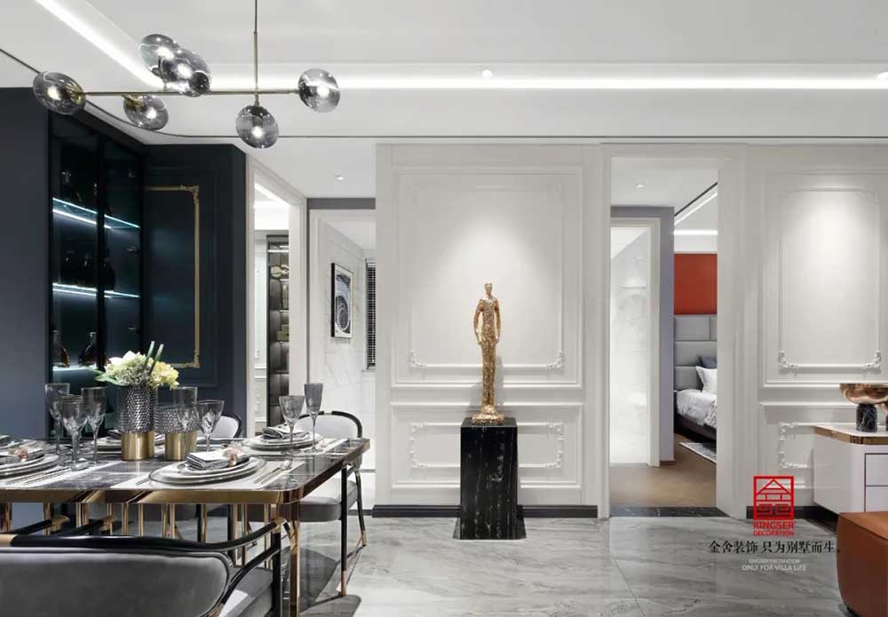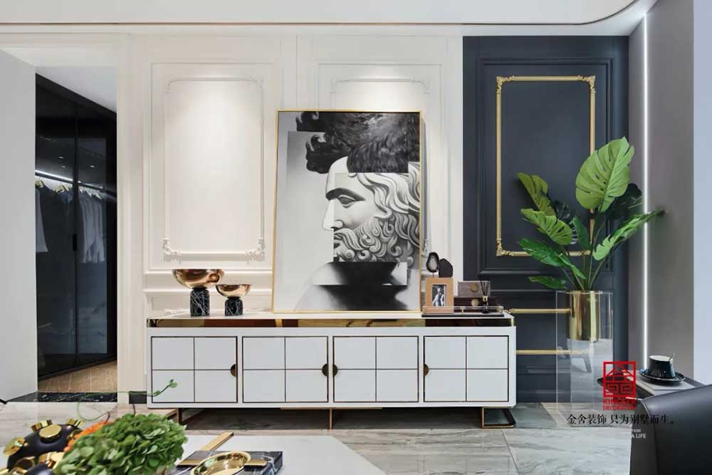 石家莊金舍裝飾-亨倫觀唐名邸118平米新古典風(fēng)格裝修實(shí)景。打破了傳統(tǒng)的新古典風(fēng)格,將元素簡化到極致,讓風(fēng)格隨著居住者而變化,生活的味道自然會(huì)隨著設(shè)計(jì)的發(fā)展而不斷變化。新古典中“古典”這個(gè)詞是家居的核心,新古典風(fēng)格化繁為簡,從整體到局部,無論是精雕細(xì)琢,還是鑲花刻金都給人一絲不茍的印象。