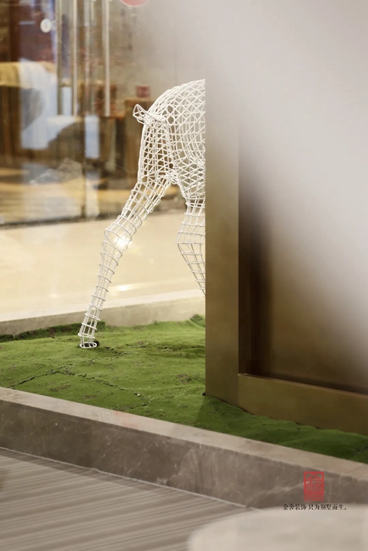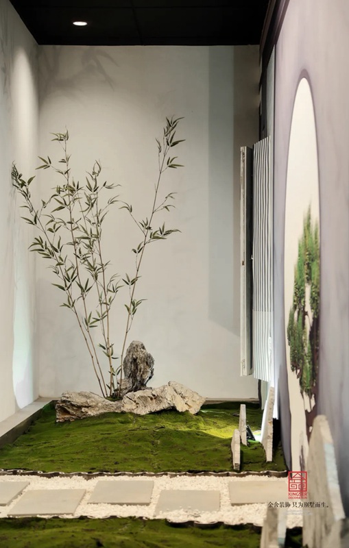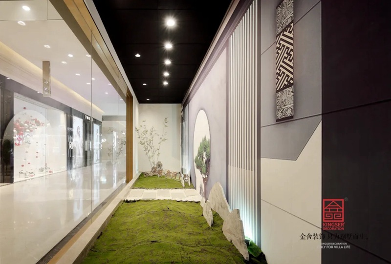 -御河上院在商場的樓盤展示區(qū)裝修實景,在設(shè)計中將自然與人文的意象融入室內(nèi)設(shè)計,綠意盎然的自然景象以其深厚的文化底蘊滋潤著人們的心靈,對自然的認識和感悟,讓人豁然開朗,心曠神怡,也就成為中國傳統(tǒng)文化資產(chǎn)的傳承、轉(zhuǎn)譯與新生 。