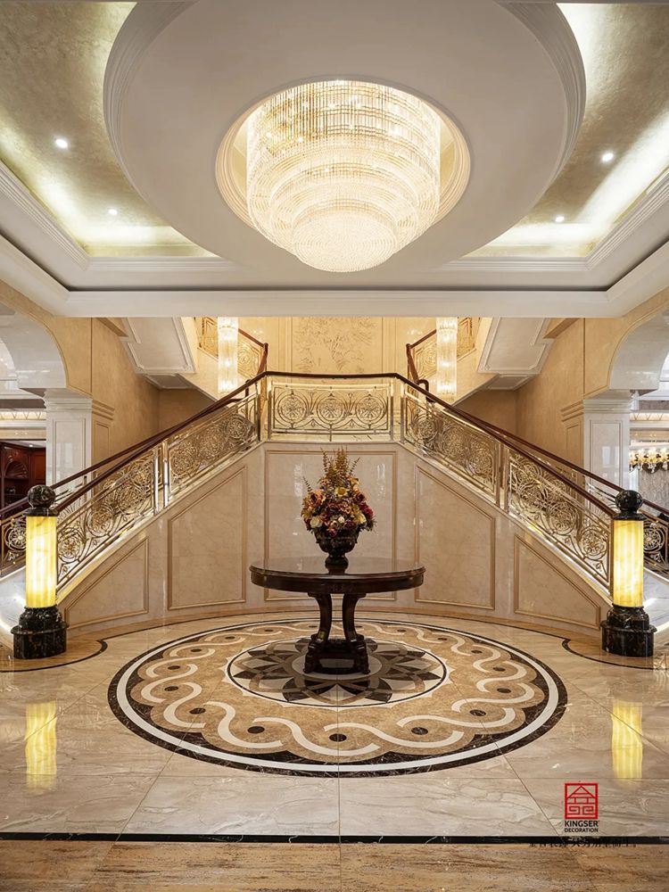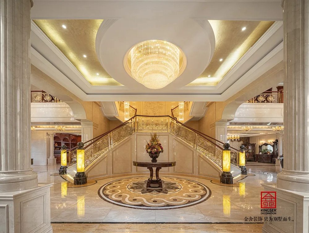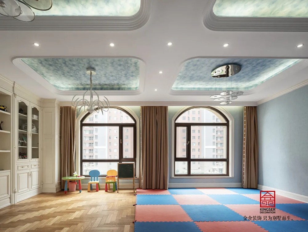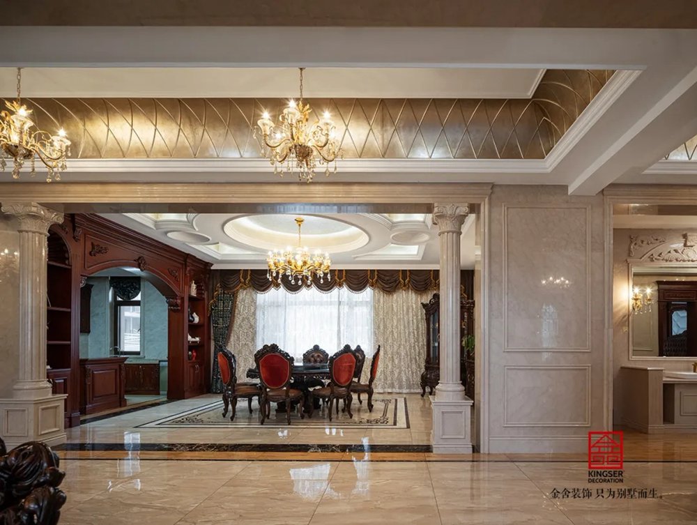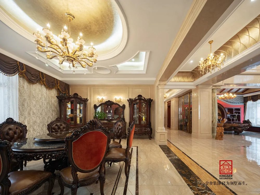 此案例為石家莊金舍裝飾-無(wú)極御瓏華府2400平米別墅歐式風(fēng)格裝修實(shí)景。御瓏華府“中西合璧”這是一套集“土建+硬裝+軟裝+庭院”一體的全案設(shè)計(jì),占地東西70米,南北50米,整個(gè)結(jié)構(gòu)坐落于小區(qū)的核心位置,打開家門,先是私有的庭院生活,再而迎面就是小區(qū)的綠化水系,視野開闊,一覽全景。方案設(shè)計(jì)為“中西合璧”風(fēng)。浪漫的歐式古典風(fēng)融入東方設(shè)計(jì)元素,嶄新的文化底蘊(yùn)得以傳承,既有歐式的富貴典雅又有中式的文化底蘊(yùn),二者巧妙應(yīng)用,提升整個(gè)空間氣質(zhì)。