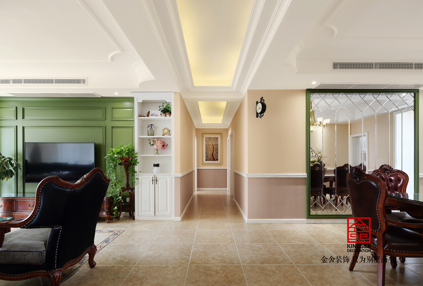 石家莊別墅裝修設(shè)計(jì)的客廳的布置頗有一種美式風(fēng)格的典型特征,厚重感十足的沙發(fā)搭配墻面淺色的畫作,嚴(yán)肅又帶有幾分輕松的感覺??蛷d中綠色的盆栽給空間增加了幾分活力,墻面的造型搭配淡雅的燈光,靈巧純潔,恬靜活潑,柔和中流露出激情。