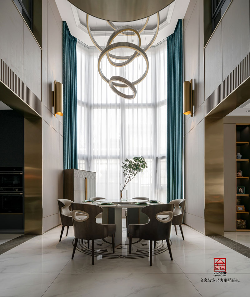 本案對(duì)于材質(zhì)和色彩的運(yùn)用十分的考究,在空間的塑造上多采用整體結(jié)構(gòu)的重塑,用低飽和度的色彩營造出低調(diào)奢華的空間氛圍,構(gòu)建出整體空間的和諧之美。巨大的挑空空間將整個(gè)別墅的空間感完美的拉伸了起來,圓形嵌套式的金屬燈就好像空間中的巨大圖騰,讓人們看到一種莫名的震撼。