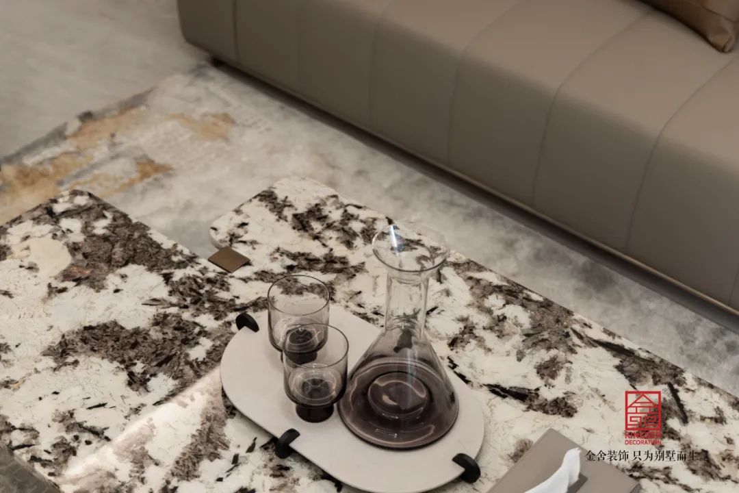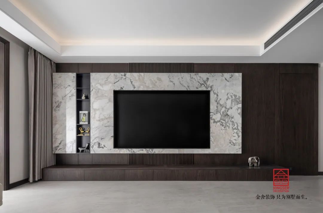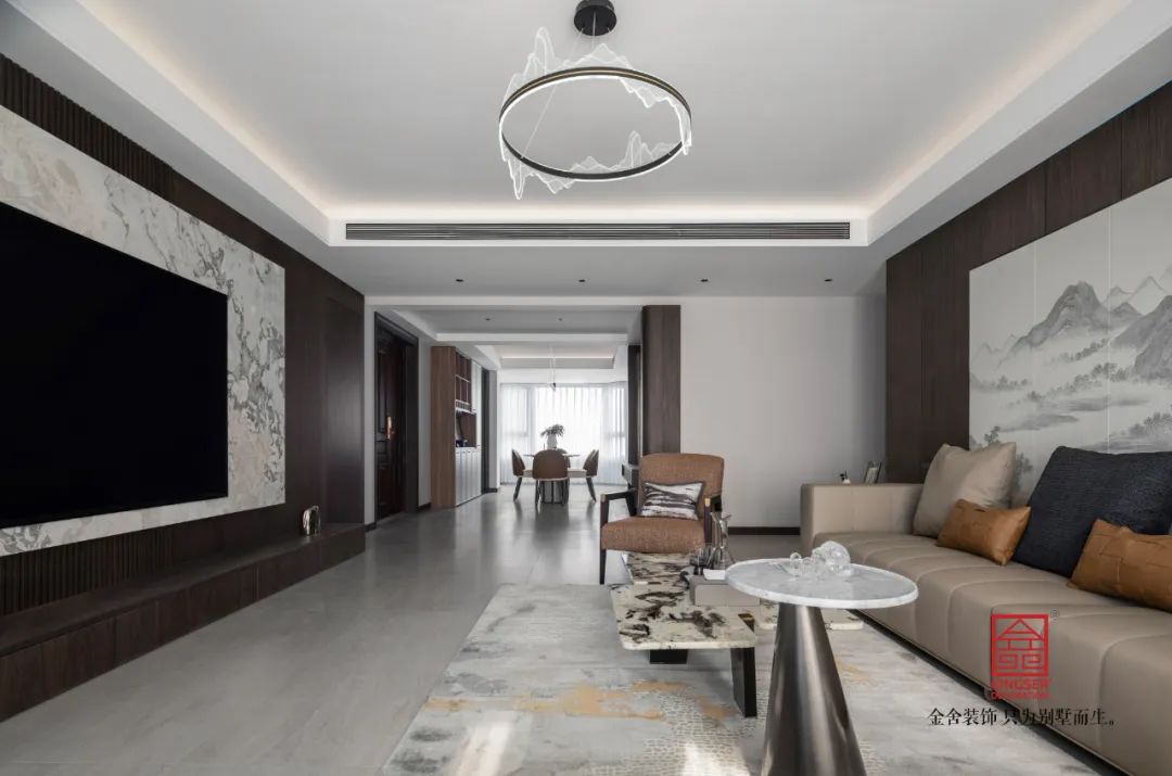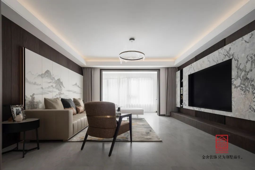 深色的墻板與大理石的配合,讓兩種不同明暗的材質在同一空間出現激情的碰撞,明暗蜿蜒的大理石紋理,也讓整個空間出現了一種流動感。沙發(fā)背景墻采用水墨山水的背燈硬包,讓空間增加了一份東方意味。
