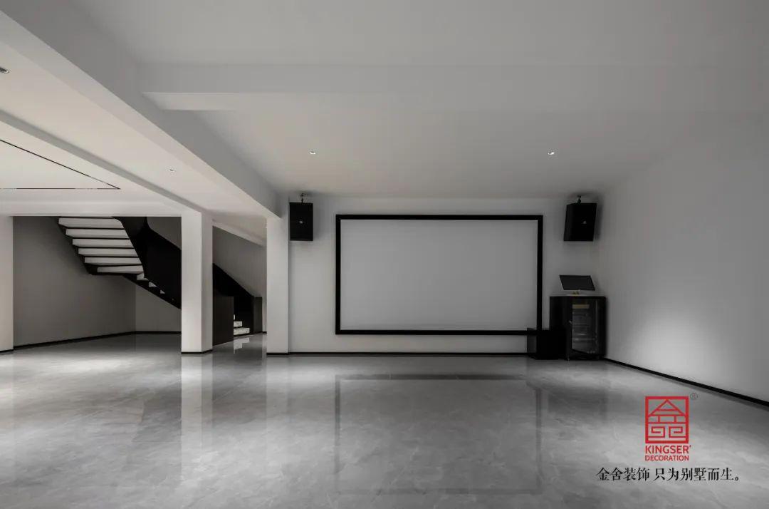 負一影音室延續(xù)了整體空間配色,就好像是正在繪制的漫畫,黑與白此時正在交替的創(chuàng)造著美與和諧。
