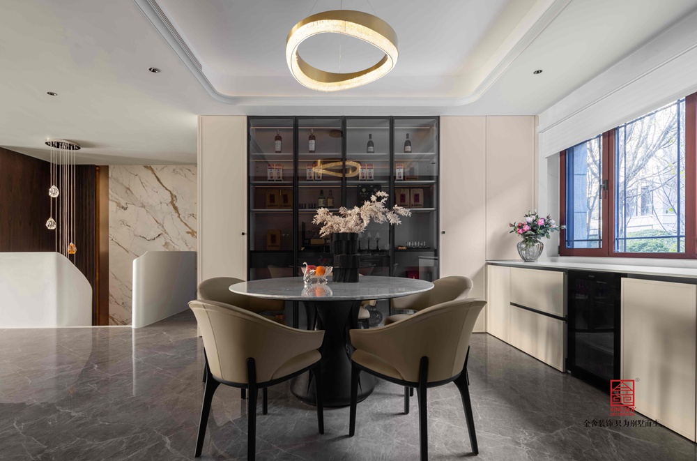 褪去城市繁冗華麗的外殼,回歸至與人的內(nèi)在共鳴,斑駁的光影在客廳空間徜徉,大理石與墻板的搭配,釋放出一種優(yōu)雅、沉靜及治愈的氛圍感,貫穿于整個(gè)別墅裝修空間的動(dòng)線。