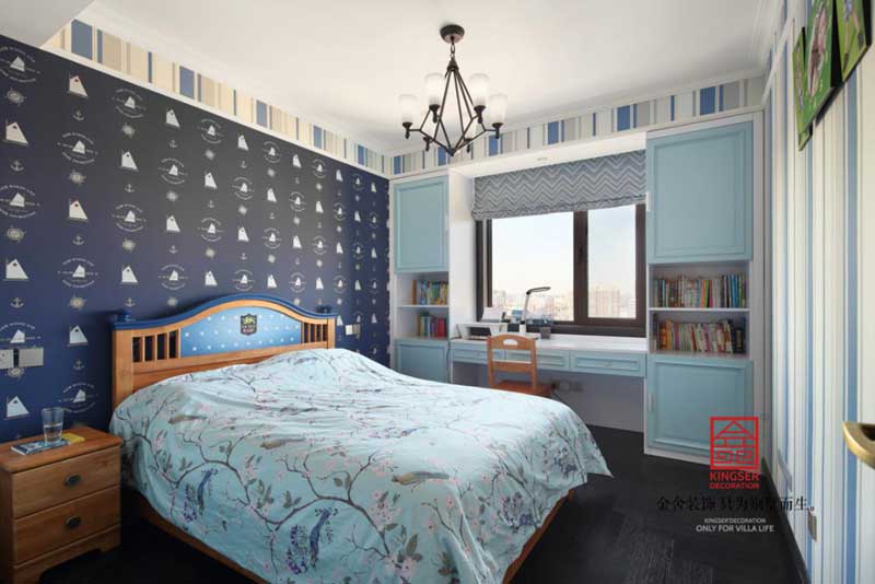 緞錦的寶石藍(lán)和絲綢的淺湖藍(lán)與背景墻象征這海天相接,相輔相成,每一個(gè)顏色都形成一種深遠(yuǎn)的意境,或蕭瑟,或廣闊,或沉穩(wěn),或舒揚(yáng),不同的情景不同的韻味成就不同的家居舒適空間。