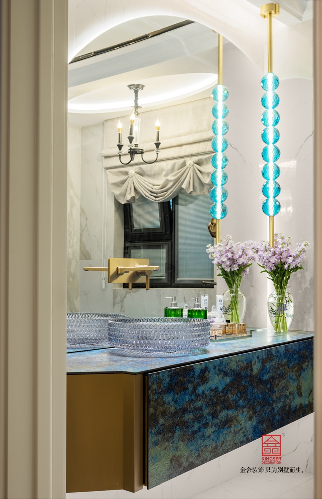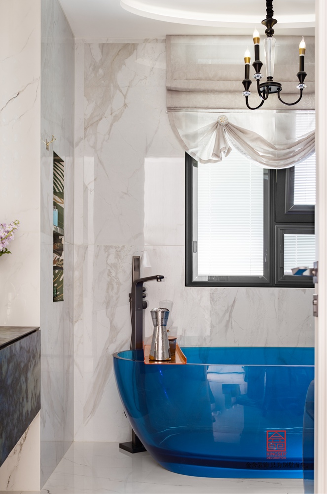 藍(lán)色多瑙河是這個(gè)空間的主調(diào),不同純度,明度,亮度的藍(lán)色,讓空間高級(jí)浪漫,主衛(wèi)打分最高,純純的法式浪漫情懷,淺海藍(lán)的透明浴缸,加之金屬銅色,奢華感十足。
