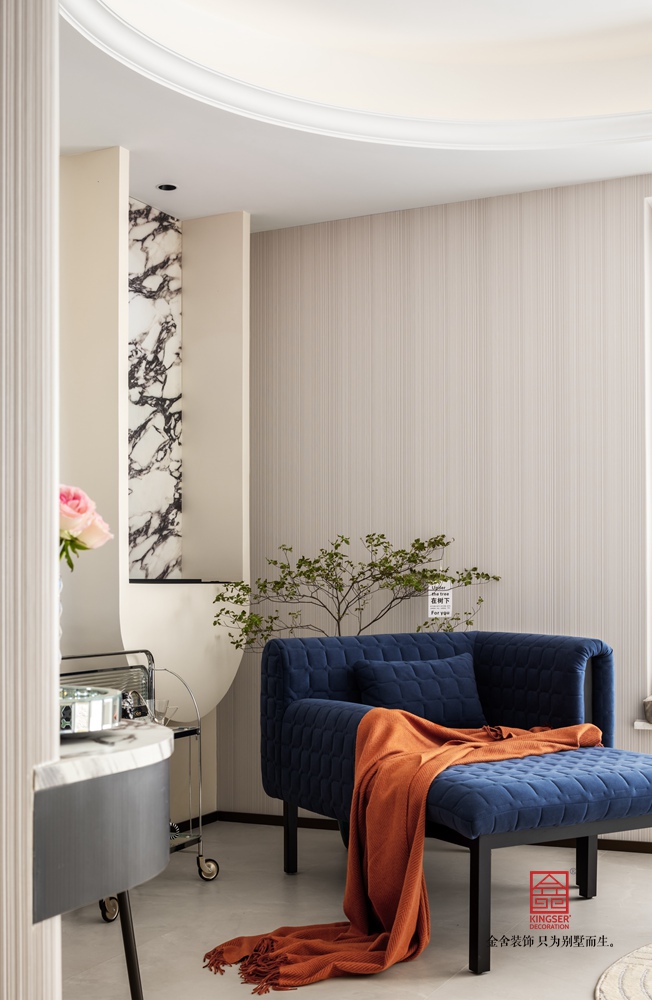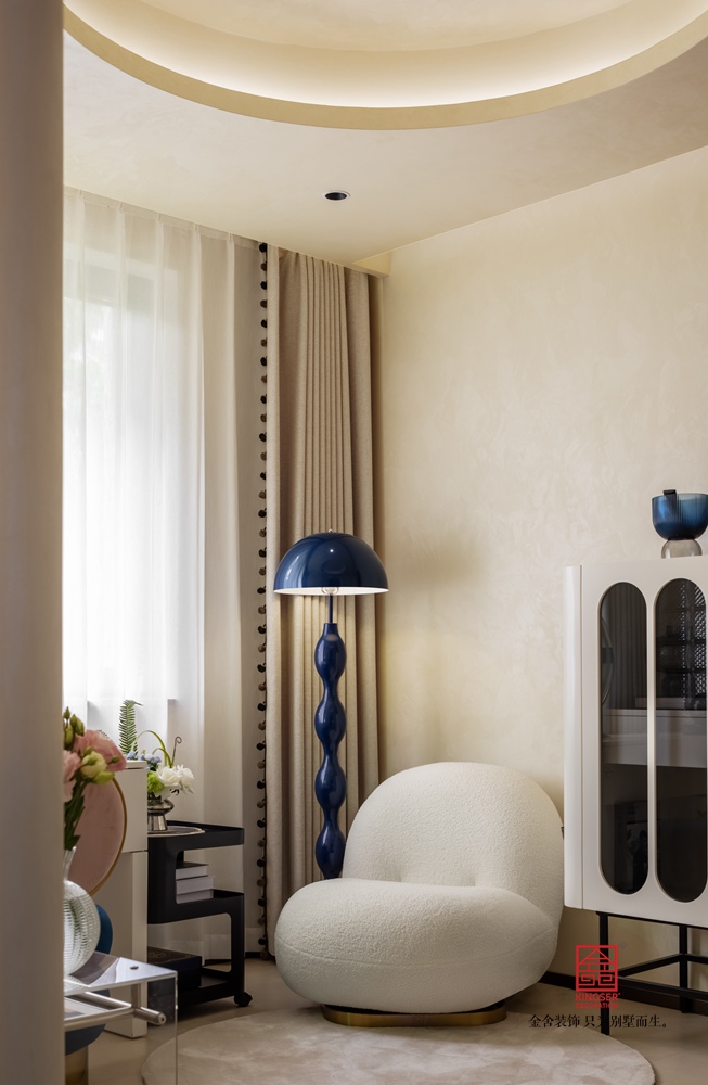 一樓空間以奶油白,深灰藍(lán),香檳金,三種主色交織出溫柔治愈的基底。