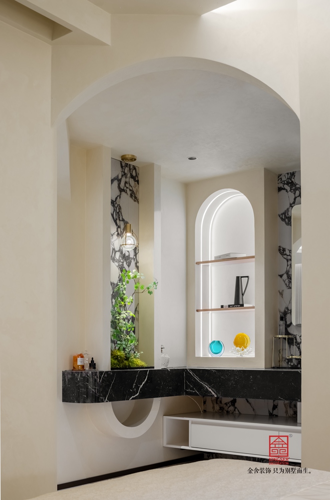 女孩房是典型的奶油風(fēng),通過兩房變一房的手法,再通過兩道拱形造型,使得兩個(gè)空間分離又關(guān)聯(lián),更為突出的是干區(qū)洗手臺(tái),寶格麗極具時(shí)尚感的材質(zhì)和負(fù)一女孩房衣帽間玄關(guān)遙相呼應(yīng),整體感兼具。