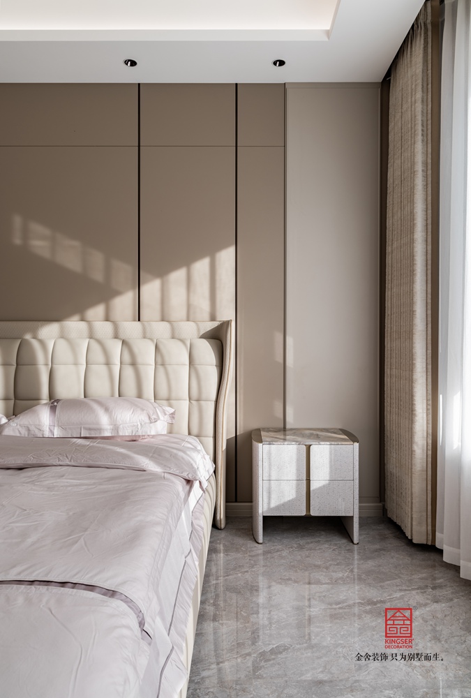 如滔滔江水傾瀉而下的石材肌理,赭石與黑色的顏色對撞,石材的堅硬與皮制的溫潤的融合,金屬的邊緣與整體溫暖的配色,這是客戶對生活的向往,也是對美好未來的構(gòu)建。