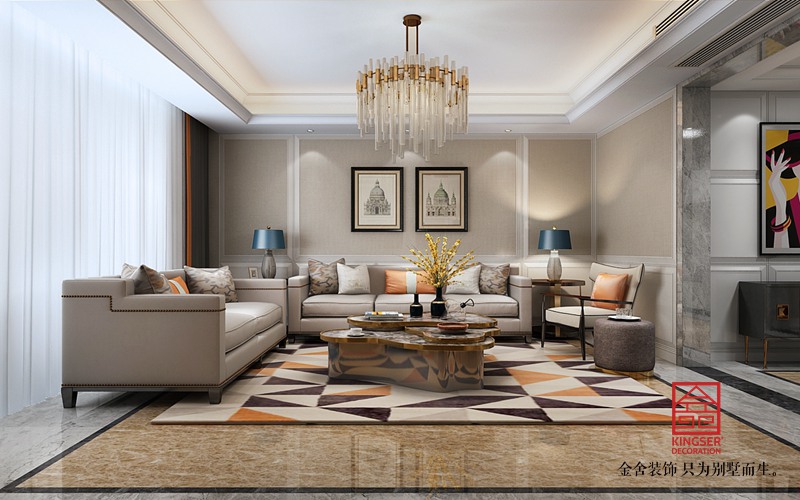 藍、黃是梵高最愛用到的色彩,我們把它融入公共區(qū)域。黃色絨布抱枕、窗簾明度最高,令人感到溫暖和愉悅,相對的臺燈就選擇了藍色,中和掉明黃的跳躍,給人以安靜、舒適的氛圍。燈管、茶幾、飾品等少量鉻金屬和黃銅色的點綴,隱隱透露著低調(diào)的奢華感,不同材質(zhì)的黃色給予了環(huán)境多層次碰撞的可能性。