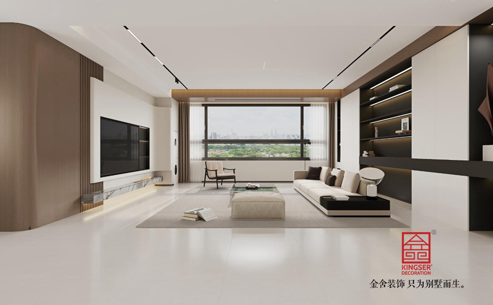 空間布局上,采用開放式設計,讓客廳與周邊區(qū)域自然銜接,增強了空間的通透感與互動性。大面積的落地窗是設計亮點,引入充足自然光線,同時將城市景觀納入室內,使空間與外界環(huán)境有機融合。