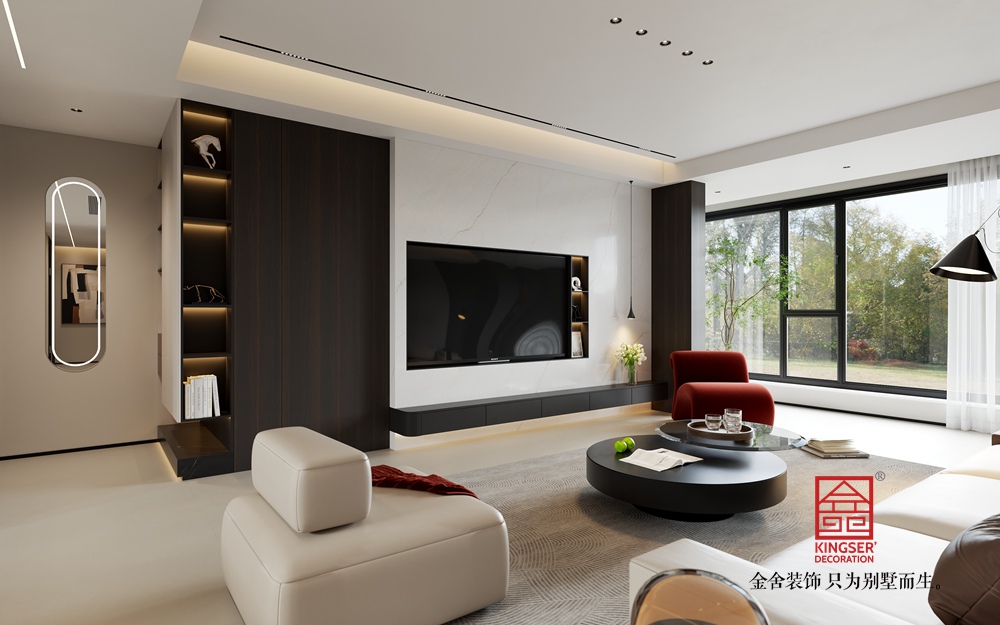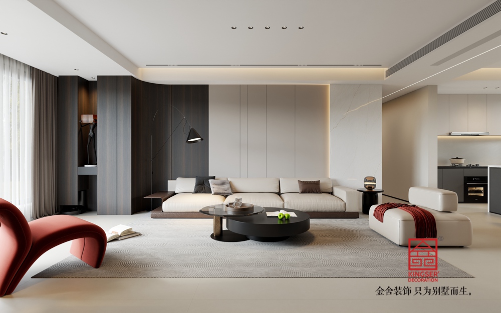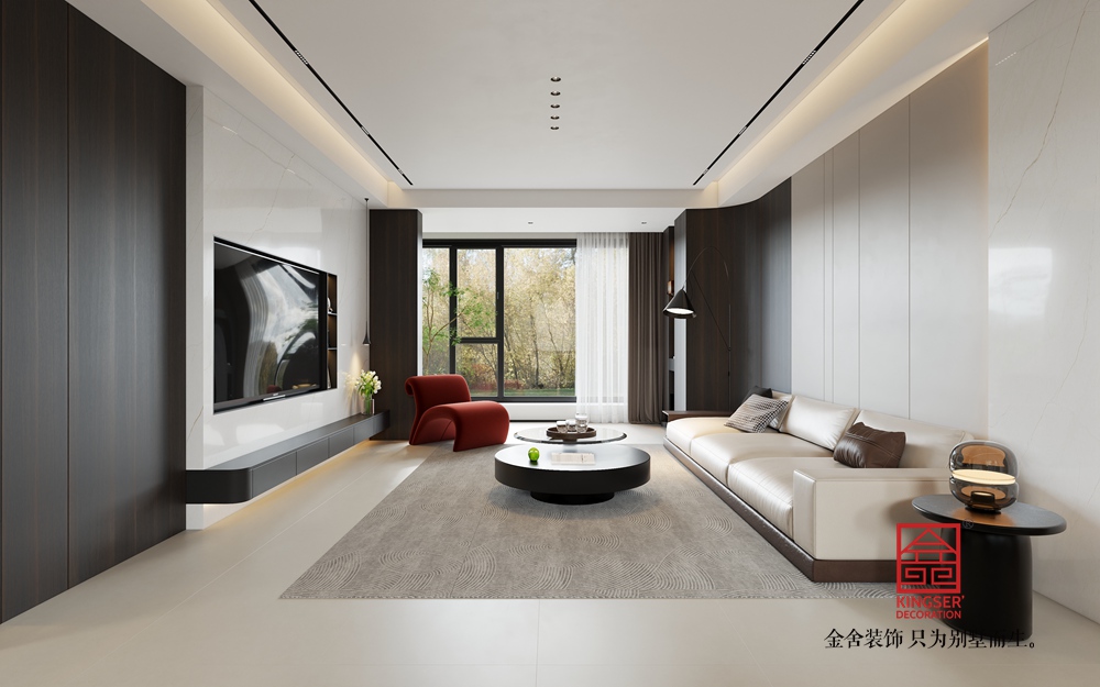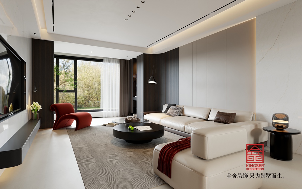 淺米色的大沙發(fā),搭配色彩層次豐富的抱枕,為休憩提供舒適且具美感的載體。黑色圓形組合茶幾,造型簡約又不失設(shè)計感,與整體空間的利落線條相呼應(yīng)。一旁的白色單人沙發(fā),搭著紅色織物,既豐富了色彩層次,又增添了溫馨感,紅色異形休閑椅更是以亮眼色彩和獨特造型,成為空間的點睛之筆,注入藝術(shù)活力。