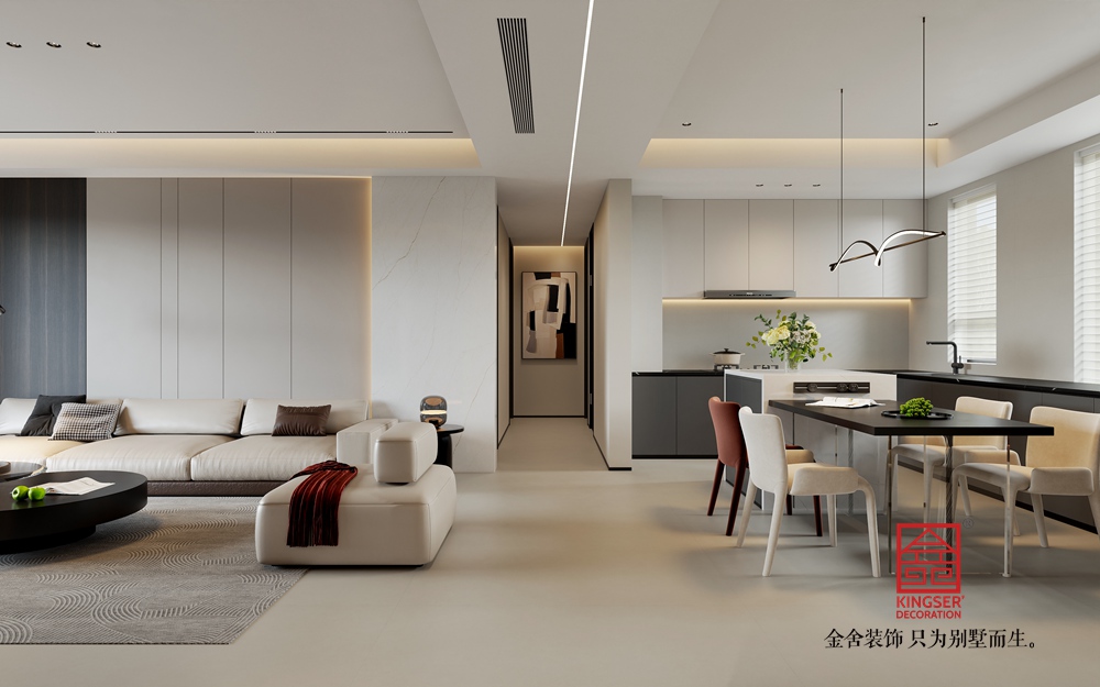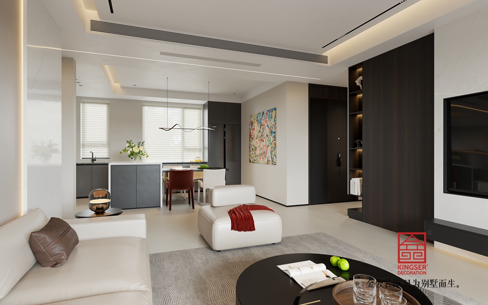 頂部的無主燈設(shè)計,借助線性光與點狀光源,營造出柔和且富有層次的照明效果,讓空間更顯靜謐雅致。地面的紋理地毯,在劃分區(qū)域的同時,也為空間帶來細膩的觸感與視覺變化。整體設(shè)計通過色彩、材質(zhì)的巧妙搭配與光影的精心營造,打造出一個兼具簡約、舒適與輕奢質(zhì)感的現(xiàn)代客廳,滿足人們對高品質(zhì)家居生活的需求。