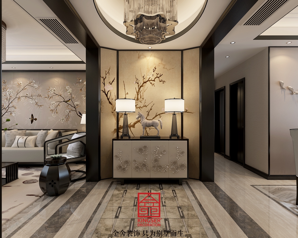 風(fēng)格定位為新中式,把門(mén)廳空間做區(qū)域劃分,充分展現(xiàn)中式風(fēng)格的對(duì)稱(chēng)要求