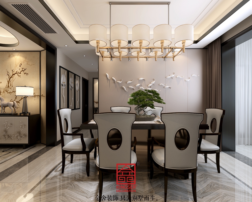 本方案為石家莊金舍裝飾-東南智匯城185平米新中式風(fēng)格裝修效果圖。風(fēng)格定位為新中式,把門(mén)廳空間做區(qū)域劃分,充分展現(xiàn)中式風(fēng)格的對(duì)稱(chēng)要求。根椐戶(hù)型及滿(mǎn)足客戶(hù)使用把鞋柜做在了前門(mén)右側(cè),滿(mǎn)足入戶(hù)門(mén)廳大宅視覺(jué)。電視墻及沙發(fā)墻應(yīng)用山水及花鳥(niǎo)圖案,展示中式風(fēng)把大自然帶進(jìn)室內(nèi)的休閑舒適風(fēng)。廚房不能滿(mǎn)足使用需求,把北陽(yáng)臺(tái)擴(kuò)到內(nèi)部,增加儲(chǔ)物空間,也更符合大宅廚房的面積需要。
